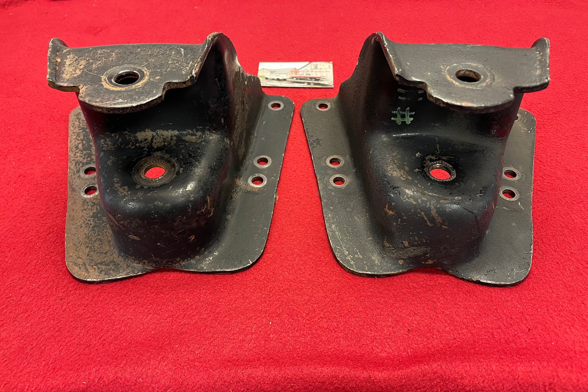 Rear Spring Front Hanger Set C10 & R10 Regular Cab Truck Part# 471696. What is picture is rear leaf spring front hangers that are removed from a C10 regular cab truck. These are specific to the description above and will not fit without modifications on other applications. These are Used and in very good condition. We will remove the rivets prior to shipping. These are being sold as a set and as pictured. We can offer individual ones as well.